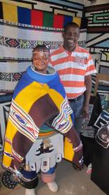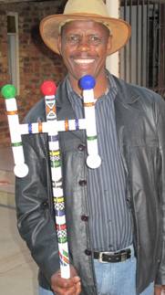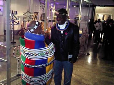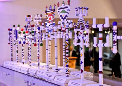 Above left: Sophie and Petrus Mahlangu chatting just before the BASA award ceremony at WAM. In the display case behind them the WAM collection of traditional dancing sticks or Iintelefomu are displayed. Above left they appear in Sophie's shop in Mobhoko village in the Nkangala district of Mpumalanga Their twenty individual awards, each between half and a full metre high, were a contemporary interpretation of the traditional Itelefoni form. The idea of reviving the Itelefoni form was conceived by Julia Charlton, Senior Curator of WAM.
